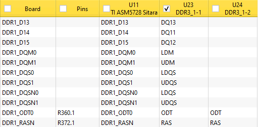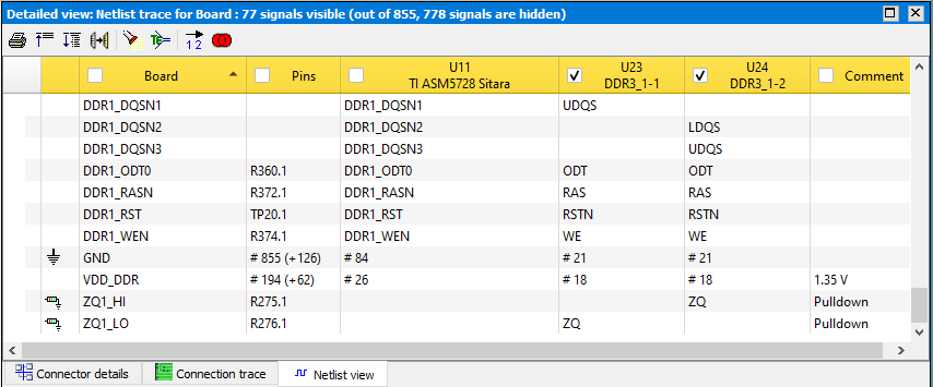 New in ConnTrace 2.0 is the Netlist view. This view shows all signals defined in a netlist in a tabular manner, with the connected pins, for one board or multiple boards. You can add any number of components to the view to easily see how they connect to each other. When present in the PCB netlist file ConnTrace will show pin labels, like DDR3_A1 instead of just the pin number (AE3). Check boxes in the header in combination with sorting and name filtering allow you to concentrate on areas of interest.