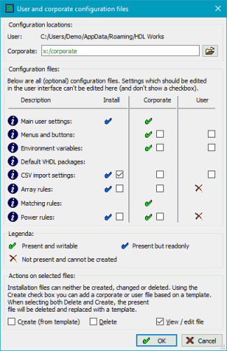 IO Checker can use a number of configuration files, which can reside in the user or corporate location. To simplify the use of these configuration files and show which files are present a new ‘User and corporate configuration files dialog’ is used. The dialog allows you to setup (create/edit/delete) configuration files for which no user interface is present. New files are created using a template from the installation showing you the required format.